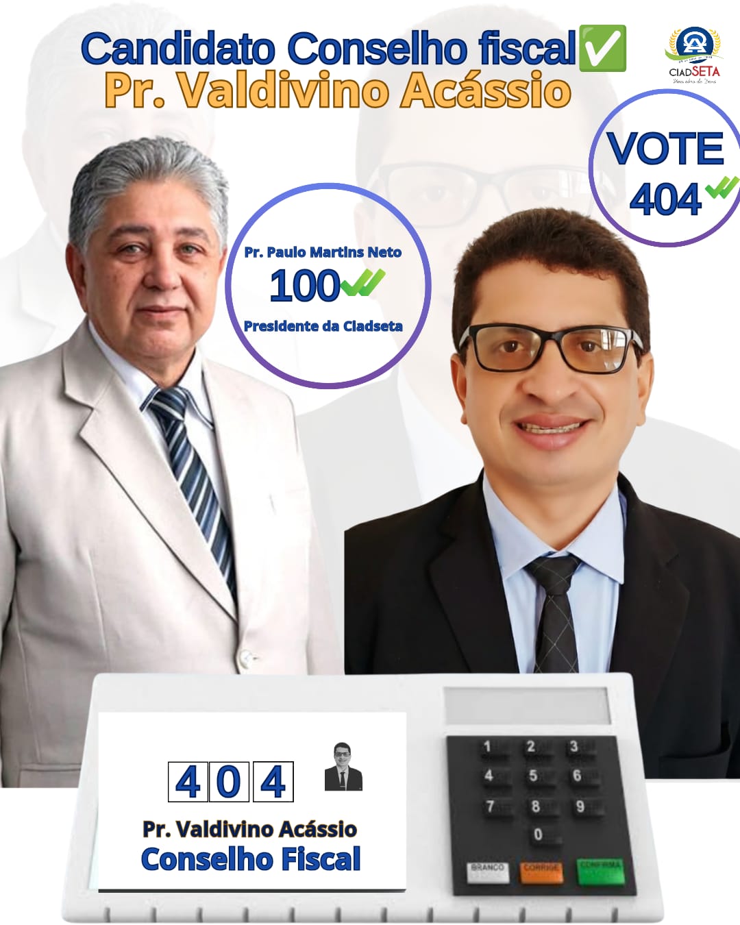 Concorrendo ao Conselho Fiscal com o número 404, o pastor Valdivino Acássio afirma que encara essa nova etapa como parte de sua missão espiritual e administrativa.